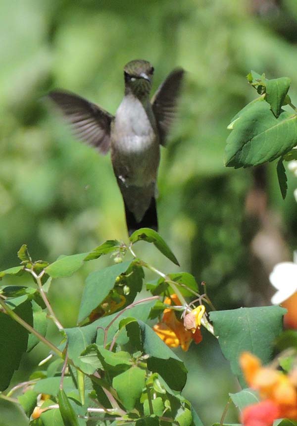 A hummingbird in the jewelweed near the house's front door.