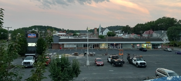 The view from the walkway outside my third-floor room at the HoJo, looking south towards the center of downtown Staunton. Click to enlarge.