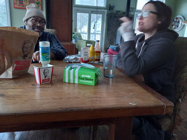 On the way home from the gynecologist, Gretchen stopped at Kentucky Fried Chicken (maybe it's just called "KFC" these days) to get some food. In the past, there was nothing for a vegan at KFC, but recently they've launched a plant-based chicken nugget product based on Beyond Chicken, and they've even advertised it in mainstream media such as Albany's big retard rock station. We ate them with vegan ranch and the kind of hot sauce one puts on Buffalo wings (KFC ofers no vegan sauces), and they were surprisingly good. They had the exact flavor I remember from when I used to eat KFC, which, I'm told, leans heavily on white pepper in the "secret ingredients" of the breading. Not that this food was healthy to any stretch of the imagination. The box even had translucent splotches on it from where it had soaked up grease. The nuggets claimed to be "plant-based" but no claim was made that they were actually vegan. They might well have been fried in the same vat of oil with pieces of formerly-living chickens.