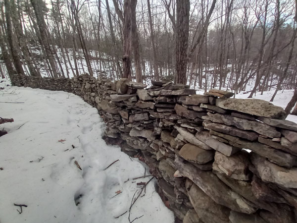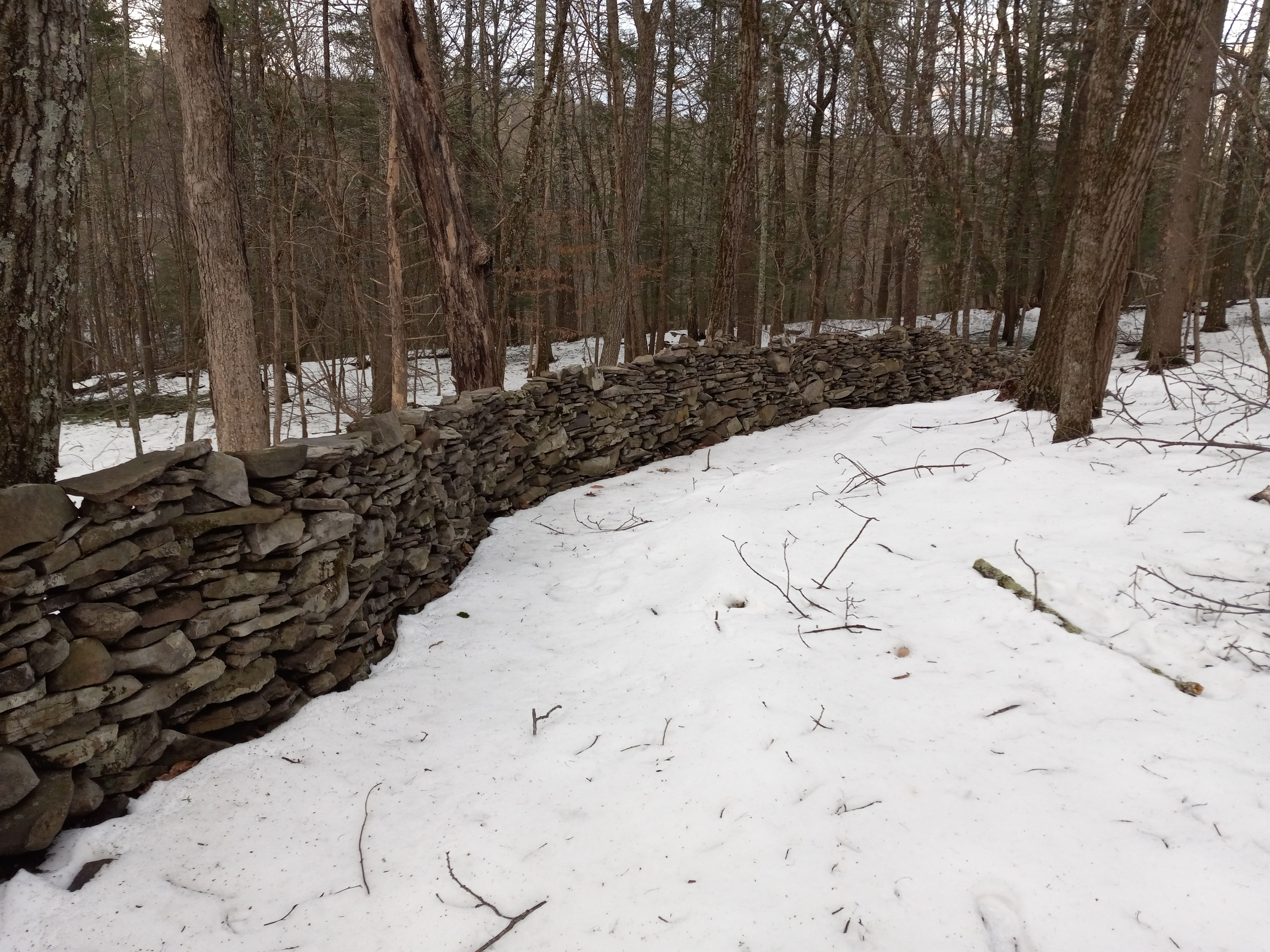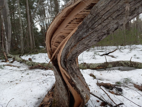 Before dark, I went outside to walk around in the fresh air. It was still unseasonably warm (with temperatures in the upper 40s or perhaps even the 50s) and much of the snow and ice had melted. This revealed a hazardous archipelago of dog shit in the yard, which I spent something like a half hour cleaning up while listening to a YouTube clip about another parent killer, Grant Amato. Then I hiked up the Farm Road a little ways, then down to the Stick Trail, and walked around in the vicinity of the stone wall and shale cliffs above the Chamomile looking to see what kind of damage the recent ice storm had inflicted. The worst damage was to the white pines, though I only saw one whose entire top had snapped off; mostly the damage was a few lost limbs and a thick new ground cover of pine needles torn off by the shattered ice. Hemlocks are the other major evergreen, but I saw very little damage to them; their branches are better at drooping under load and are much less brittle. I also encountered an ironwood tree (Ostrya virginiana) that had been broken over by the weight of ice; possibly this was due to its relatively large overwintering catkin buds, which held on to enough cumulative ice to exceed its structural capacity. But ironwood wood is extremely tough and it doesn't really break. Instead, it had twisted and delaminated, ending up more ropelike.