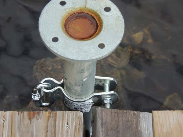 One of those pipe gate hinge brackets (with quick link) attached to one of the dock's pipe piles.