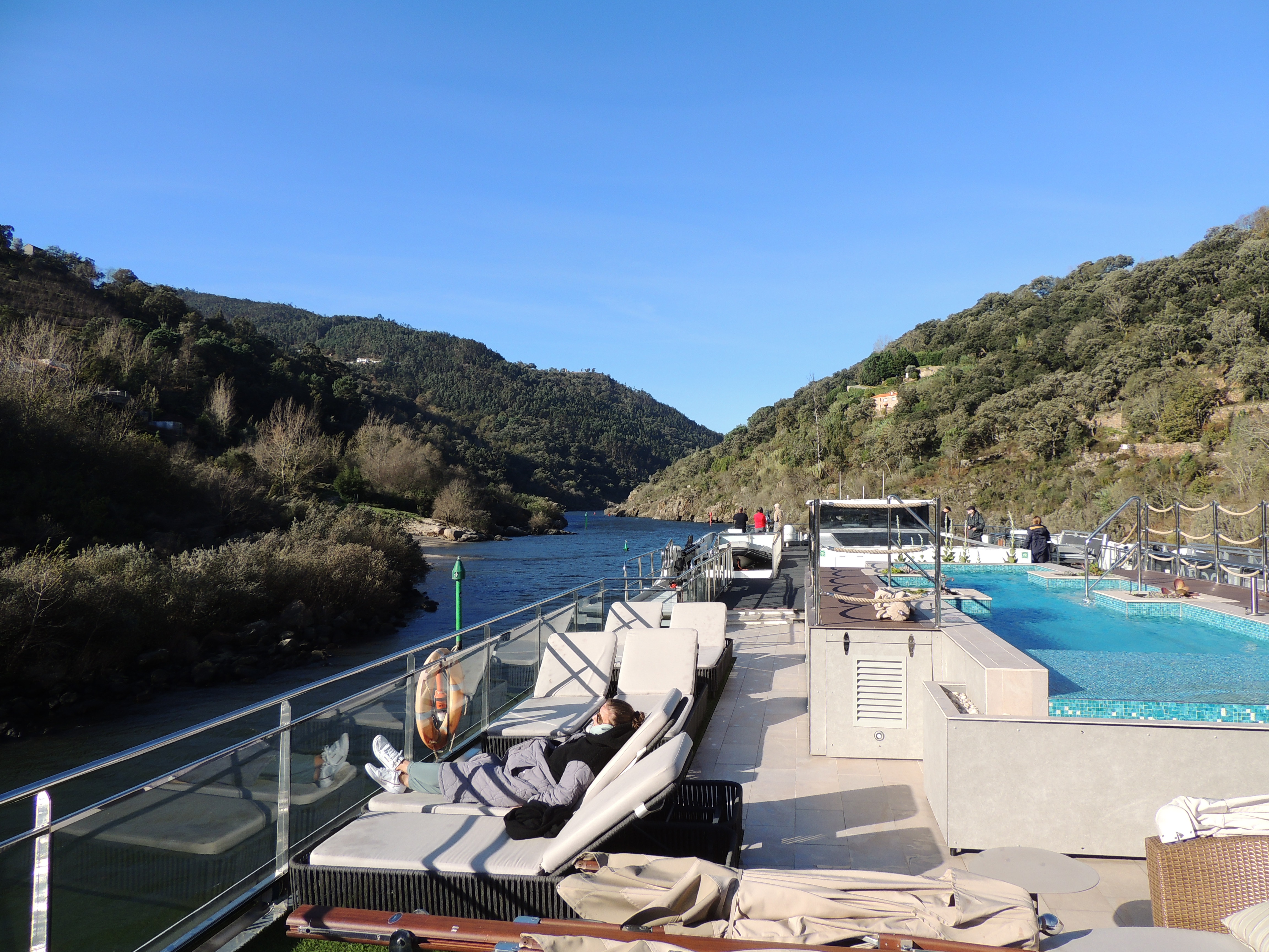 Gretchen looking for a sunny spot on the deck after we descend the Carrapatelo Lock.