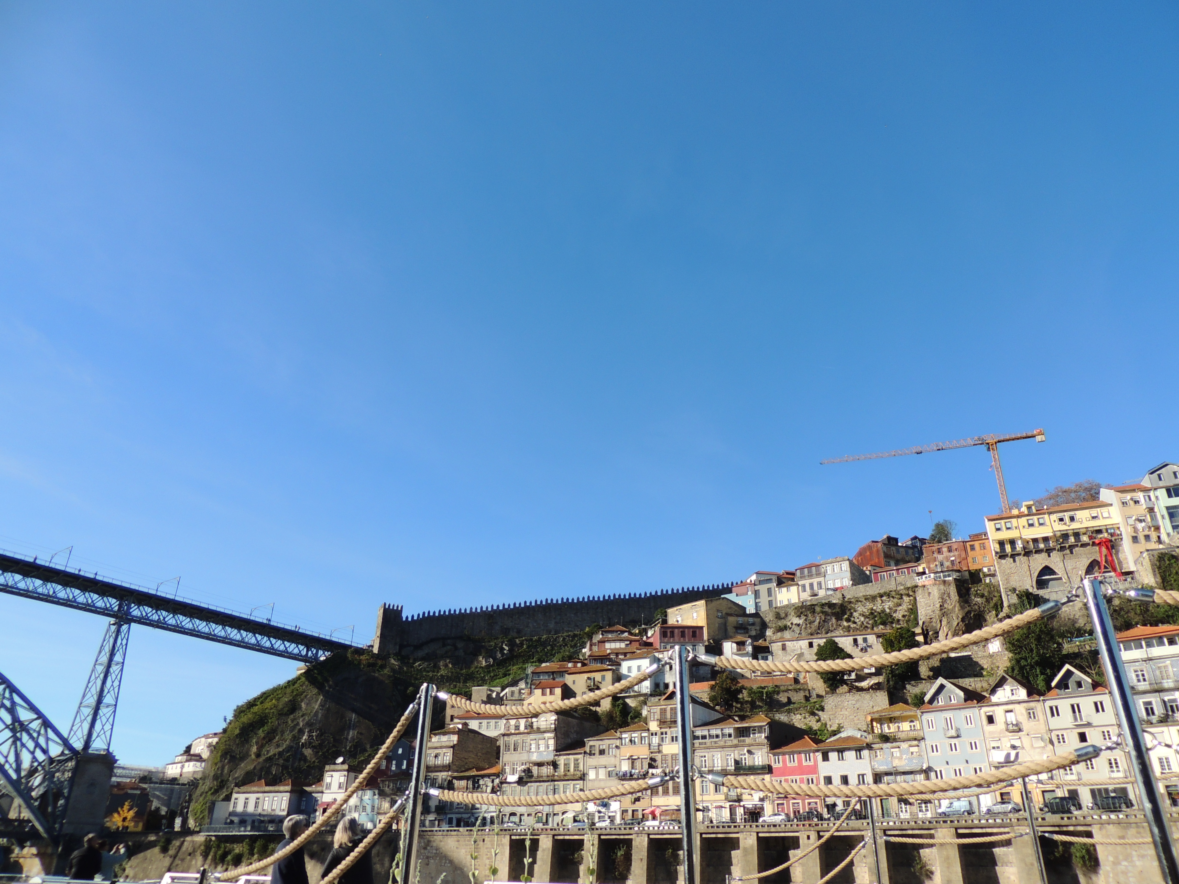 Approaching another iron bridge called the Luís I Bridge, this one not by Eiffel but heavily influenced by it. It's interesting in that it has two totally different levels of deck, one for people at the top of the gorge and another for those down near the river. Also note the simple castle just right of the bridge.