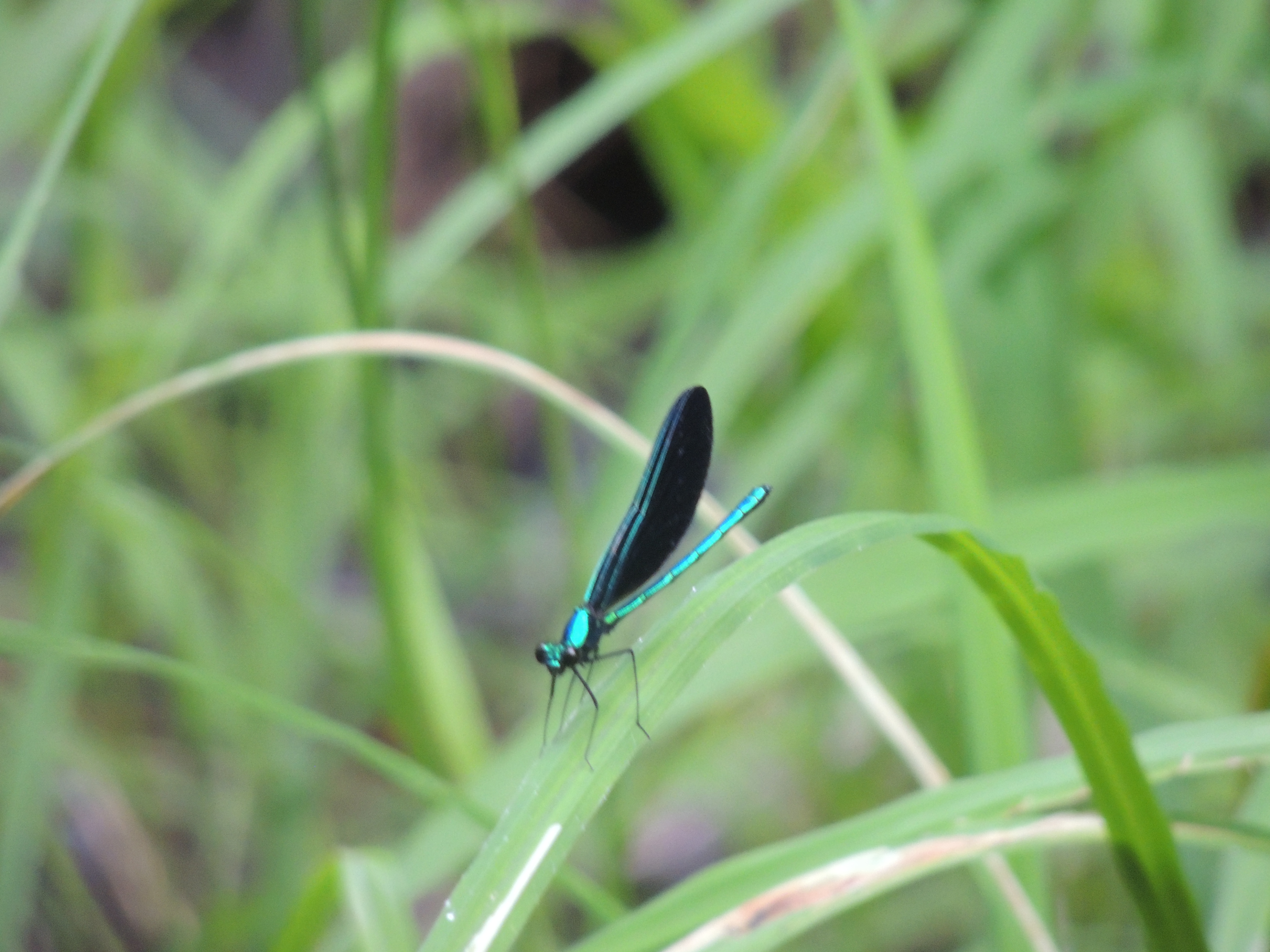 An irridescent green damselfly (probably an ebony jewelwing) near the point of bifurcation. Such damselflies aren't present along the lakeshore and seem to only operate along streams. I remember damselflies like this one when I was kid playing in Folly Mills Creek.