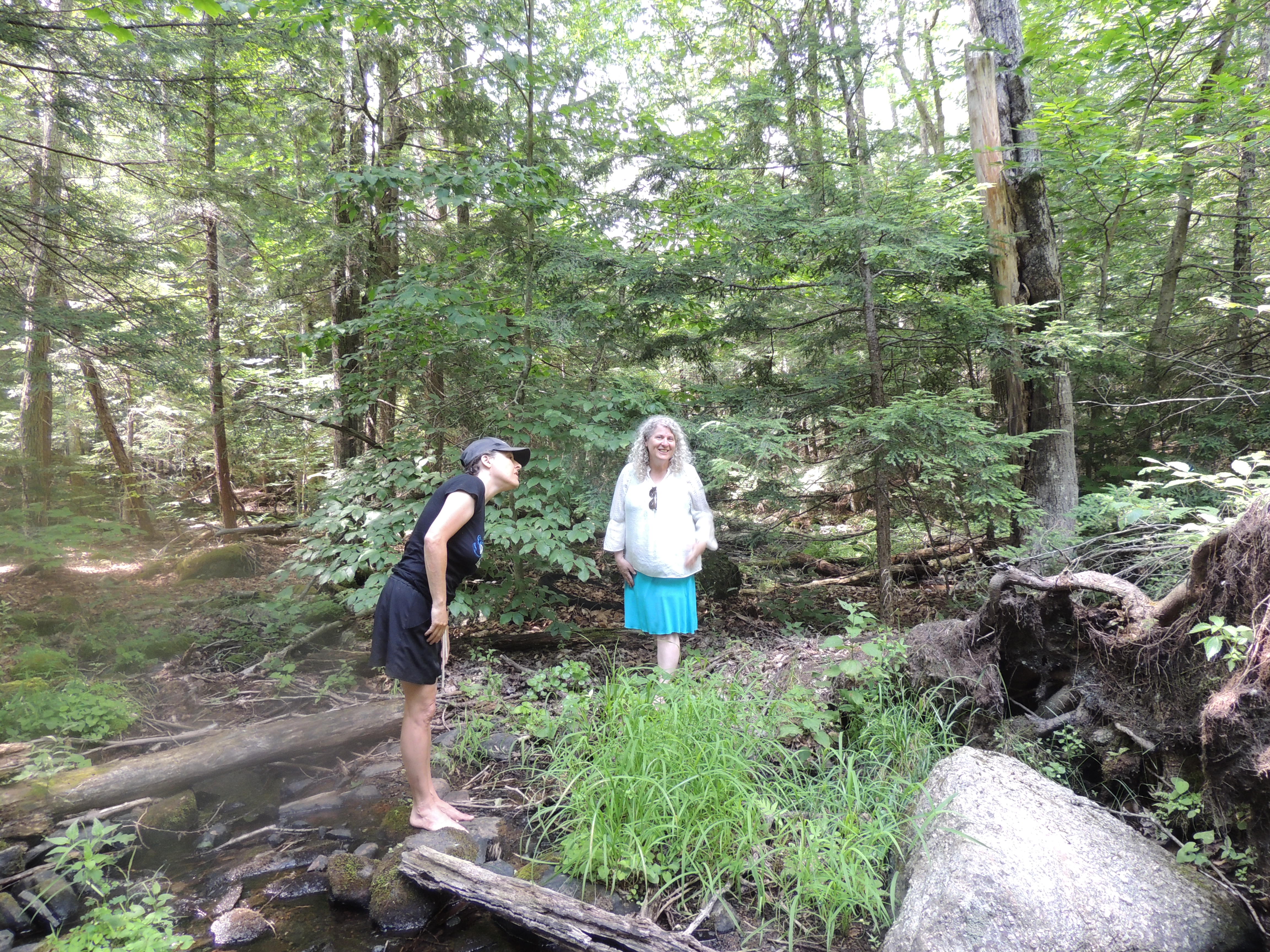 When I finally went down to the lake (via my more direct trail), I brought a travel mug containing a cocktail of gin and SPORTea. At the time, Gilly was in the lake on one of the two-bladder "water hammocks" and Gretchen was swimming around near the dock, perhaps using a swimming noodle at times so as not to have to tread water at all. I went and fetched the canoe because Gretchen had said something about wanting to show Gilly the outflow bay and apparently her shoulder is too fucked up to paddle herself. (Her knees are all scraped up from a fall; perhaps that is why her shoulder is injured.) Gretchen paddled in the front, I paddled in the back, and Gilly sat on the narrow yoke in the middle. When we got to the beaver dam at the outflow, we all managed to get out of the canoe (which was really only difficult for Gilly) and walked to solid ground (another thing Gilly had trouble finding). In fairness to Gilly, the surfaces near the outflow beaver dam are inconsistent, not too solid, slippery, and sometimes contain sharp sticks (and we were all barefoot). Wading through the pond between the outflow beaver dam and the next dam down, sometimes my feet plunged deep into mud and then other times immediately found a solid — if slippery — rock just below the water's surface. Gretchen, meanwhile, was helping Gilly find her way along the shoreline to the north.