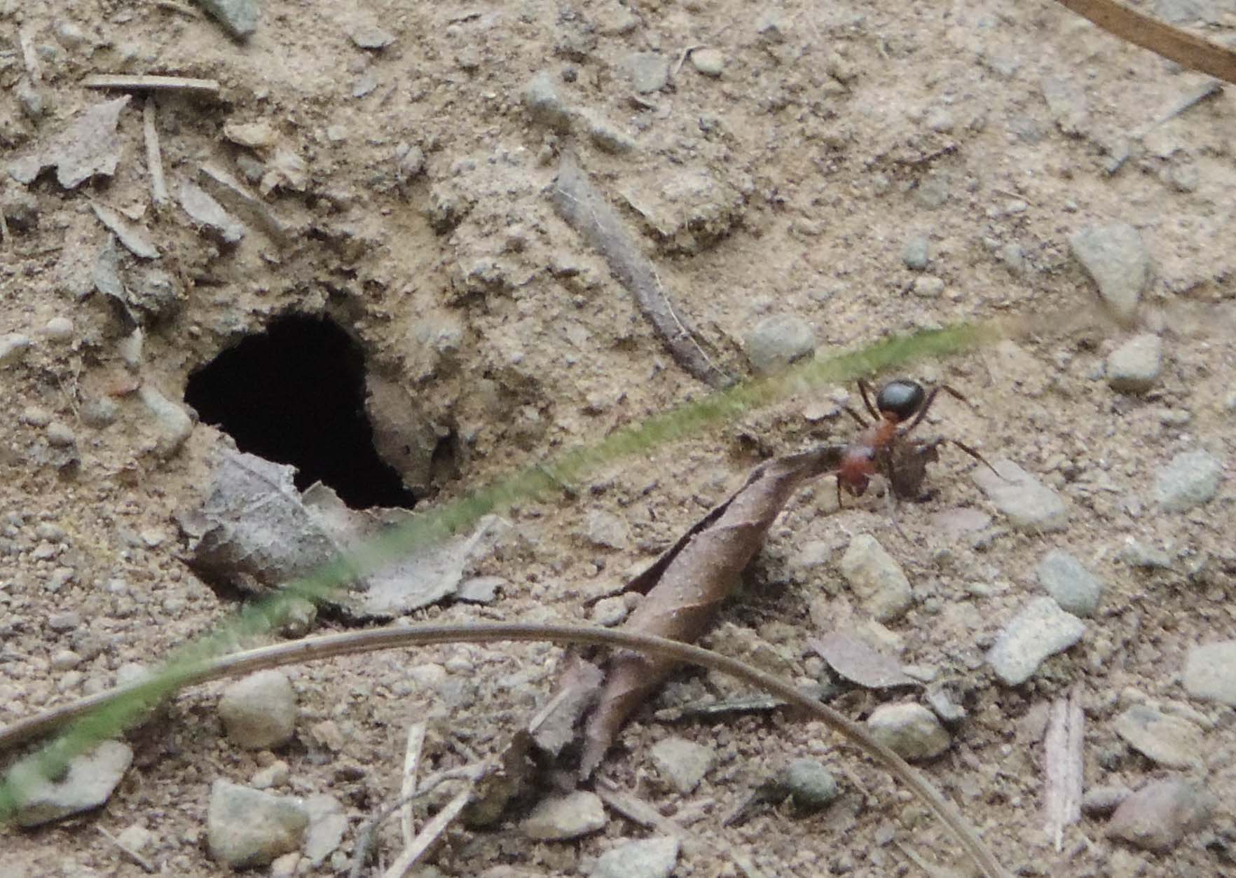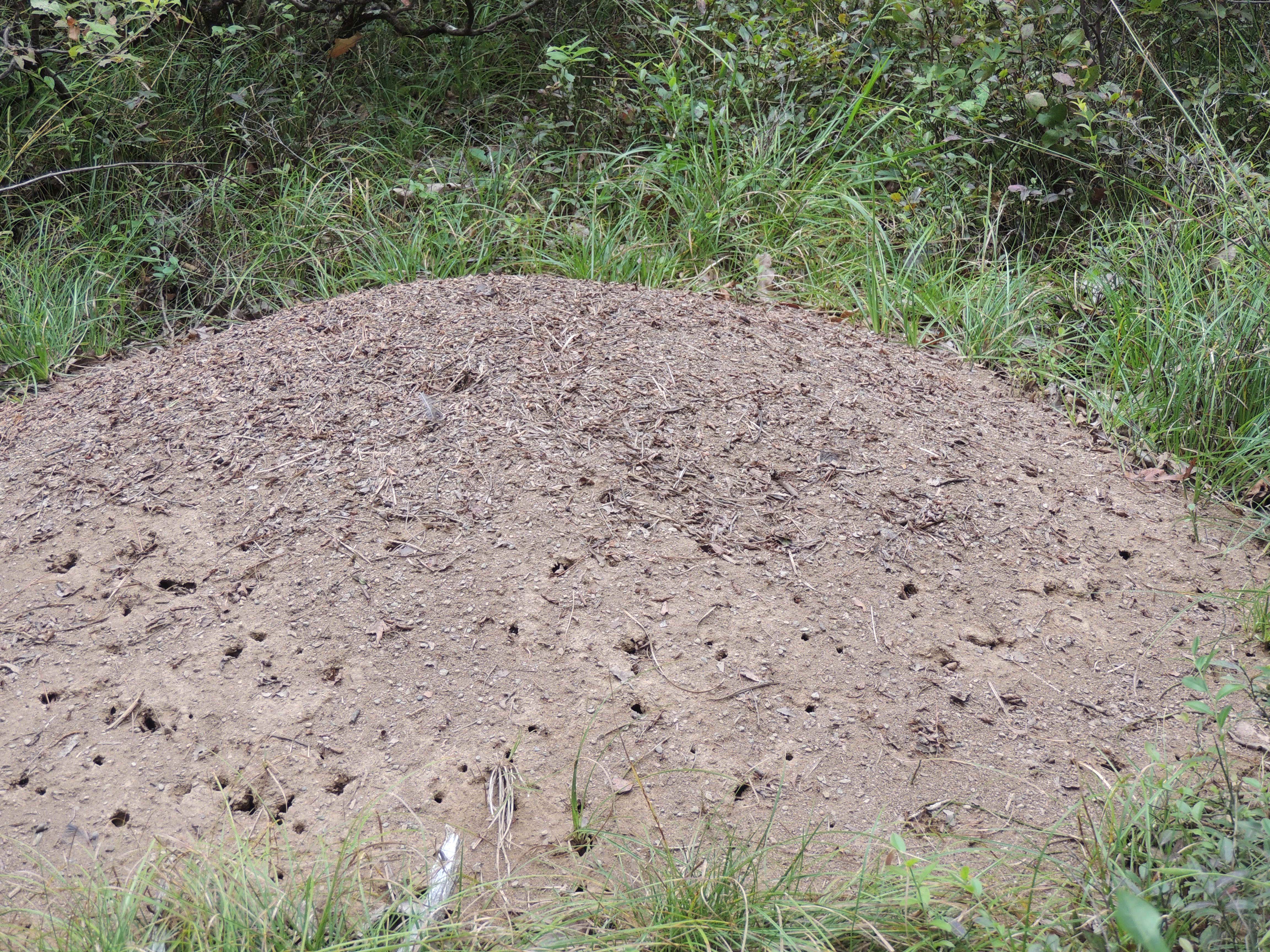 This morning when I took Charlotte for the walk that Gretchen would normally take her on, Neville surprised me by coming too (normally he only goes on the morning walk if there are unusual people on it, which in this case I kind of was). I took them to the abandoned go cart track and then hiked home through the scrubby pine-oak forest on the flatlands atop the topmost escarpment. Along the way I saw a huge mound created by the combined effort of hundreds of thousands of large ants with both black and red body parts.
