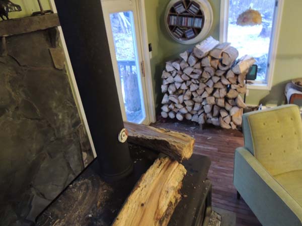 Most of the results of today's firewood haul, some of which I'd already burned by this point. There was a thin dusting of snow outside at the time.