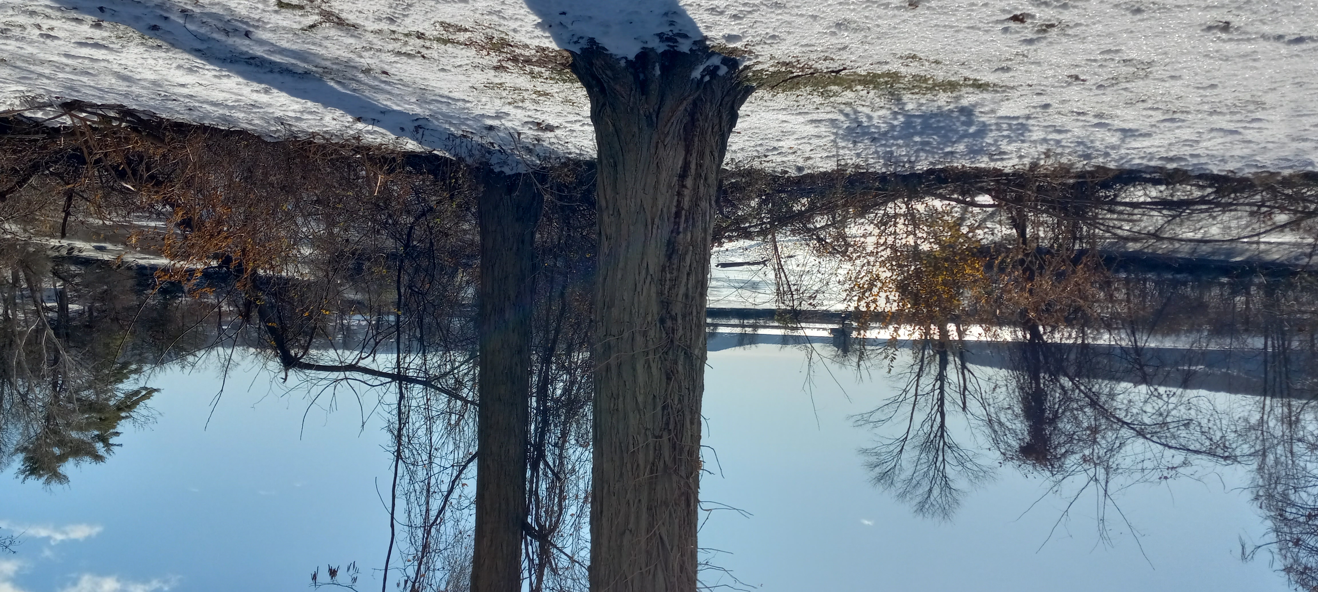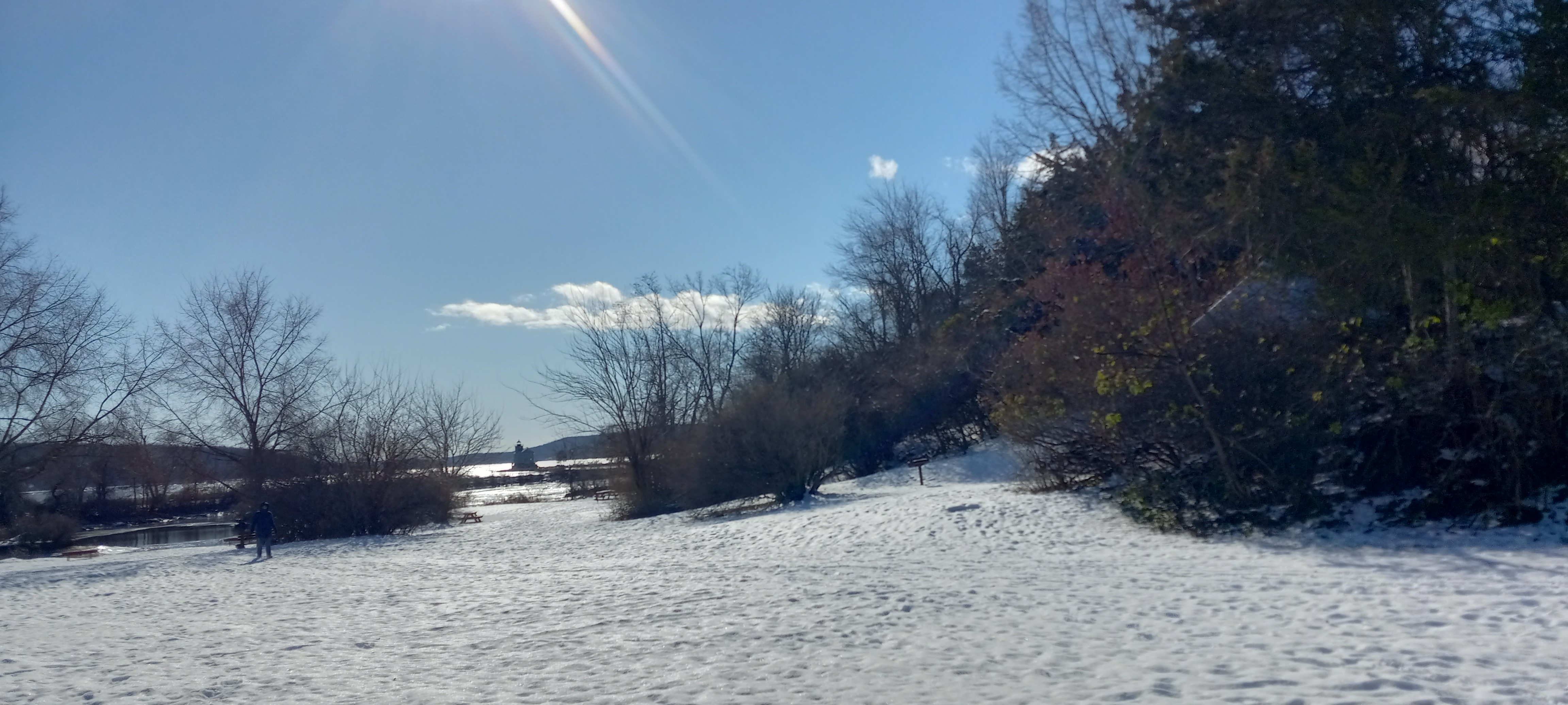 This morning Gretchen and I both had our respective coffees and briefly played Spelling Bee in front of the a woodstove fire in the living room. But then we had to convoy to VanKleeck's to drop off our Chevy Bolt to get new tires, an inspection, and all that. After dropping off the Bolt, Gretchen drove us through a previously-unknown redneck suburb of Kingston on Tuytenbridge Road to get over to 9W south and ultimately the park at Kingston Point. The plan was to walk the dogs there to give them a little change of scenery. Conditions were sunny but cold, with a face-freezing wind at the dog park at the top of the hill. There were no other dogs (or humans), but we let Charlotte and Neville run around in there anyway so they could check their "peemail." Then we walked down to very near the Hudson itself, where we found a segment of still-functional railroad track, kept in service to support a short trolley line starting near the Roundout. The wind wasn't as bleak down there, and we were able to walk about 800 feet before turning around and heading back. Along the way we passed a large flock of mallard ducks, who swam away from us quacking among themselves. Our dogs saw them but somehow knew it was pointless to chase after them.