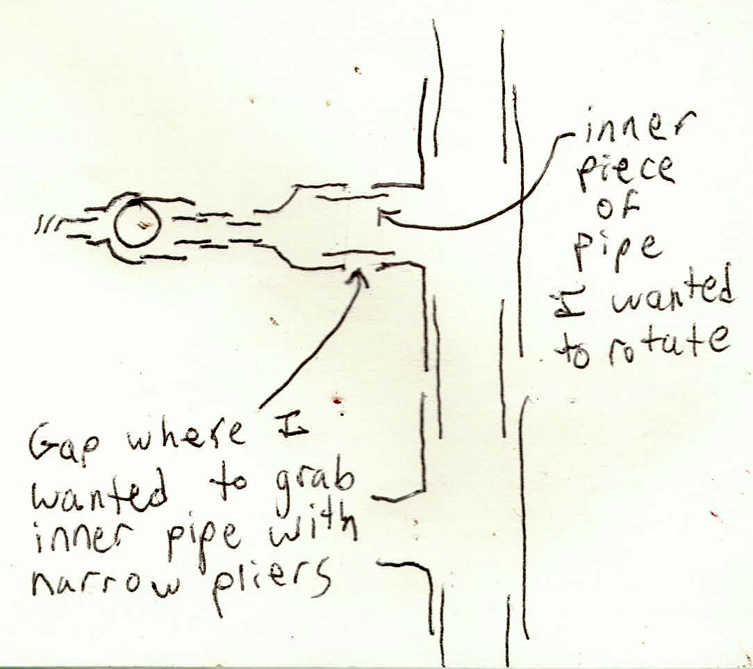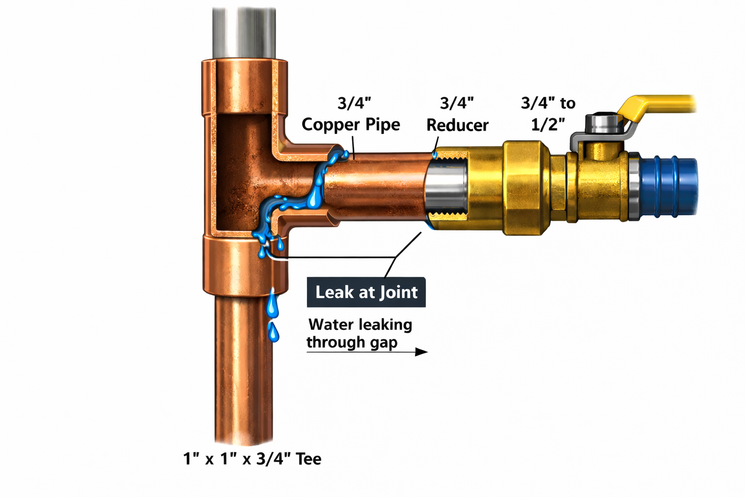 I tried to have ChatGPT draw a diagram of how that final leak was happening. Even after I insisted there were no leaks coming from the right side of the junction, there are still drops of blue remaining there and a line from the "Leak at Joint" caption pointing there. Also, despite multiple attempts to get ChatGPT not to have the leak seeming to flow from the top back into the pipe and somehow out of the middle of the fitting, it insisted on making the water do that. Furthermore, the gap where my narrow pliers needed to go is way too wide and there are threaded fittings in places that were sweat-only. Click to enlarge.