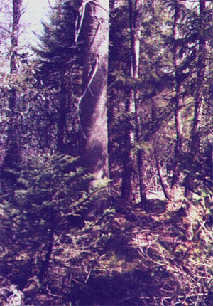 Our inventory of the upland ( slope ) forest was divided between the afternoon of 8-14-98 and the morning of 8-16-98. While large Red Spruce are the most conspicuous elements of this forest, it is generally dominated by Yellow Birch. A number of the oldest of these Birch have both large diameters and widely-spreading crowns, indicating that they originated early after the forest was cut over. Beech appears to be second in abundance, but smaller on average than Spruce and Yellow Birch. Beech also appears to dominate the sapling layer in many places and some of these saplings showed signs of the Scale/Nectria Complex. Red and Sugar Maples taken together appear to be about as abundant as Beech. As is the case with Yellow Birch, a number of maple are large with spreading crowns, and thus also imply an early origin after logging. By contrast Black Cherry has only a scattered presence and, while large, was not as well-formed as is usual for this tree in the Alleghenies. Although both Cucumber and Fraser Magnolias were present, no White Ash ,Basswood, oaks or many other deciduous tree species common to the Central Appalachians were seen, and only a single small Hemlock was noted in this forest.
