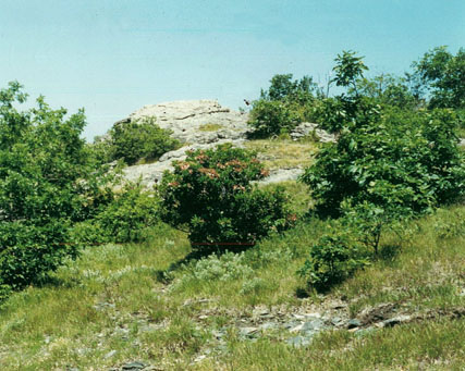 A number of different macrohabitats are found on the Ridge and Mountain. Among these are low elevation mesic forests, cliffs, seeps, and the tundra-like and prairie - like openings which have been referred to as "glades" (Porter, 1975; Rawinski and Wieboldt, 1993) and occupy various positions on and immediately below the summit. These varied habitats have given rise to a remarkably diverse flora that contains a number of species rare in the southern Appalachians or indeed globally in some instances. Examples are such prairie grasses as Big Bluestem (Andropogon gerardi) and Yellow Indian Grass (Sorghastrum nutans) on the south-facing meadow below the summit, the rare Large-leaved Grass of Parnassus (Parnassia grandifolia) and the Appalachian endemic Gray's Lily (Lilium grayi) of seep areas. Others are Mountain Rattlesnake-root (Prenanthes roanensis), Fir Clubmoss (Lycopodium selage), Rocky Mountain Woodsia (Woodsia scopulina), Bog Bluegrass (Poa paludigena) and Mountain Sandwort (Arenaria groenlandica). Rawinski and Wieboldt (1993) classified the glade flora using the Braun-Blanquet tabular method (Westhoff and van der Maarel, 1973). Several of their communities, in particular their Juniperus virginiana- Quercus stellata/ Castilleja coccinea Association were not observed by us because they lie somewhat below the summit in areas not visited by us. Also, of the species listed above, only Mountain Sandwort is reported on here, although we were able to document many other species and interesting communities.