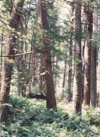 While there is ample evidence of disturbance at Cathedral in the form of remains of openings invaded by Pitch Pine and hardwoods, this disturbance appears to have been on a small scale and confined to normal gap formation. Runkle (1991) places the area in a region dominated by small gap disturbance as distinguished from Pennsylvania's Allegheny Plateau, where he finds larger scale blow-downs and fires to be of equal or greater importance. Evidence of such large scale disturbances in the latter region were presented by Hough (1936) and Hough and Forbes (1943). A point made by these authors is that fire was less prevalent in Hemlock than in other less moist forests and in forests on exposed topography. However, if preceded by a blow-down, any Hemlock forest became vulnerable to fire. In any case, little or no evidence of fire was observed by us at Cathedral.