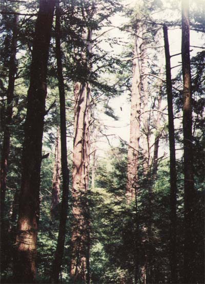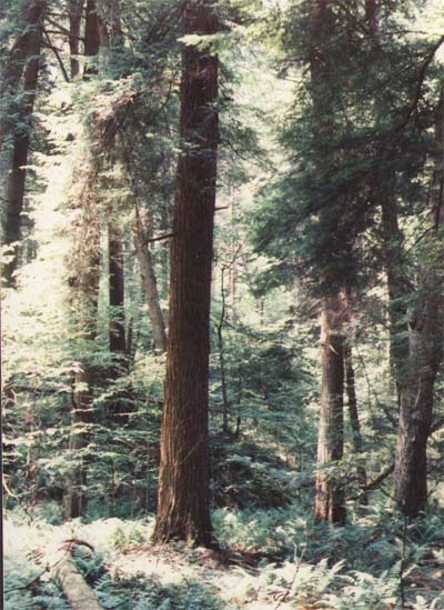 The Cathedral Forest was studied in some detail by Bieri and Anliot (1965), who gave most attention to canopy species. They identified several different communities: Hemlock Rhododendron, Hemlock Fern, Hemlock Duff and Maple Cherry Birch. Their determinations of dbh and basal area frequencies of Hemlock demonstrated the abundance of young, small diameter trees and the prominence of veterans in the dbh range of 40 inches (one m) or more. Also of considerable interest was their measurement of forest interior light intensities, which were found to be only 3.6% of those in an adjacent open field.