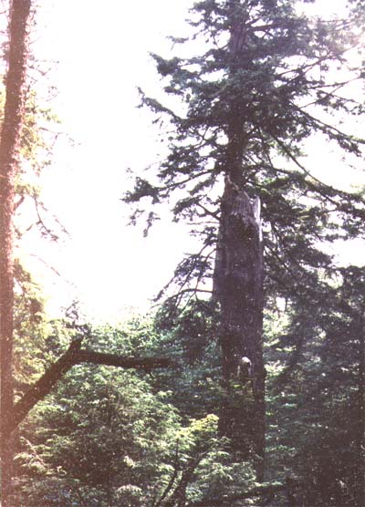 We now made a right turn, still on the Cathedral Trail, and observed a few one foot (0.3 m) dbh dead, but still standing, Pitch Pine (Pinus rigida ) that probably once occupied an opening in the dominantly Hemlock forest, and in which fast growing hardwoods eventually shaded them out.
