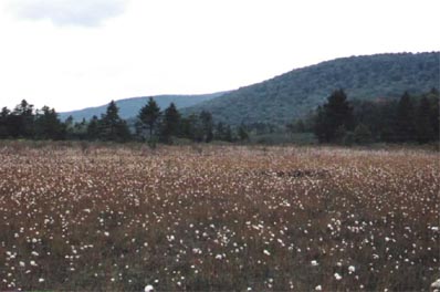 Our third inventory of this visit, that of the morning of 8-6-98, occurred during a brief clockwise traverse of the Botanical Area boardwalk. Passing first through a section of swamp forest, we noted in succession the following: a Hemlock, Red Spruce and Yellow Birch canopy of mixed age, Black Elderberry, Spotted Jewelweed, Black Cohosh, Oswego Tea, Thornless Blackberry, Abundant Carex plantaginea, Wood Nettle, Great Rhododendron, unidentified birds and their calls, Downy Wood Violet, Mountain Ash, Wide-leaved Joe-pye Weed, Foam Flower, Mountain Fern Moss (Hylocomium splendens), the manna grass Glyceria melicaria, very abundant Sensitive Fern (Onoclea sensibilis), Marsh Marigold, a large Mnium moss (likely Mnium punctatum) in a wet area, Canada Mayflower and a Yellow Clintonia.Coming then to the edge of the open glade we saw Cinnamon Fern, Cowbane in bloom, Speckled Alder, Tall Meadowrue (Thalictrum pubescens), abundant Purple-stem Aster (Aster puniceus), some with a white mold covering the leaves, Winterberry Holly, Purple-leaved Willow Herb (Epilobium coloratum) in bloom, seedlings of Red Maple, Wild Raisin, Smooth Serviceberry, Hispid Greenbrier (Smilax hispida), Southern Mountain Cranberry, Rice Cutgrass and a few patches of Sphagnum moss.