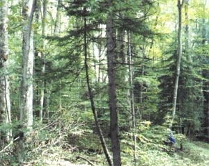 Our second inventory, on the evening of 8-5-98, began in essentially swamp forest which occurs on both sides of FR-102 leading to the Cow Pasture Trailhead.It is by and large quite young and trees generally did not exceed one foot (0.3 m) dbh. The canopy is dominated by Hemlock and Red Spruce with subordinate Yellow Birch and Red Maple. Great Rhododendron is present, although this forest is quite open. The Sweet Tooth mushroom (Hydnum repandum) was collected to add to our evening meal.