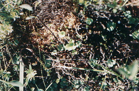Here a soil sample (no 1) was taken from the usual depth of 2-3 inches (5-8 cm) . On taking this sample it was found difficult to break through the extremely dense mat of interlocking roots. The soil recovered was rich in un-decayed fibers immediately beneath the root mat, but fine grained and very dark beneath this. A pH of 4.3 was obtained for a mix of this material both initially and 24 hours later.
