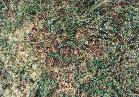 Another feature of interest was the continued presence of the normally upland species Early Low Blueberry on the hummocks, but not in the intervening depressions, a characteristic also of this plant in the Big Run Bog (Hunsucker et al, 1995) . Found here for the first time on our traverse was Sourtop Blueberry, which is stable under more moist conditions than its upland congener. These were also accompanied by Clayton's Bedstraw on the hummocks. As noted in our 1993 visit, Small Cranberry commonly occupied the depressions with a number of species of Sphagnum moss serving as a colorful background, a feature also shared with Big Run Bog.