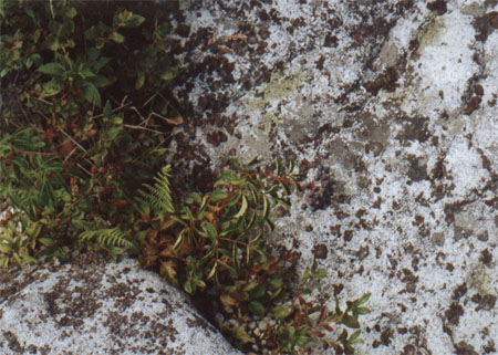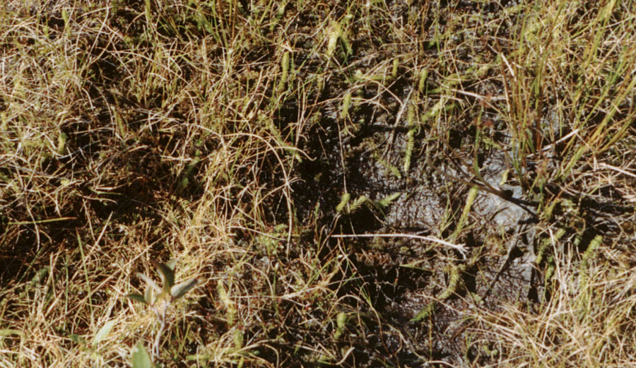 We had now reached an area of diminished slope and entered the Bog proper. A characteristic of this terrain, which however still pointed to a significant slope, was the presence of erosion channels occupied by flowing springbrooks that were directed toward the pond area described by Gibson (1970) . These channels exposed a cross-section of dark organic soil, likely peat, which in places was of the order of a meter in depth above an irregular surface of the white Pottsville conglomeratic sandstone. In places large projections or fragments of this rock protruded above the surface. As pointed out by Gibson and found to be the case in our 1993 visit, the Bog surface is hummocky in places, and different plants not only occur on the hummocks and intervening depressions, but also on different sides of the hummocks.
