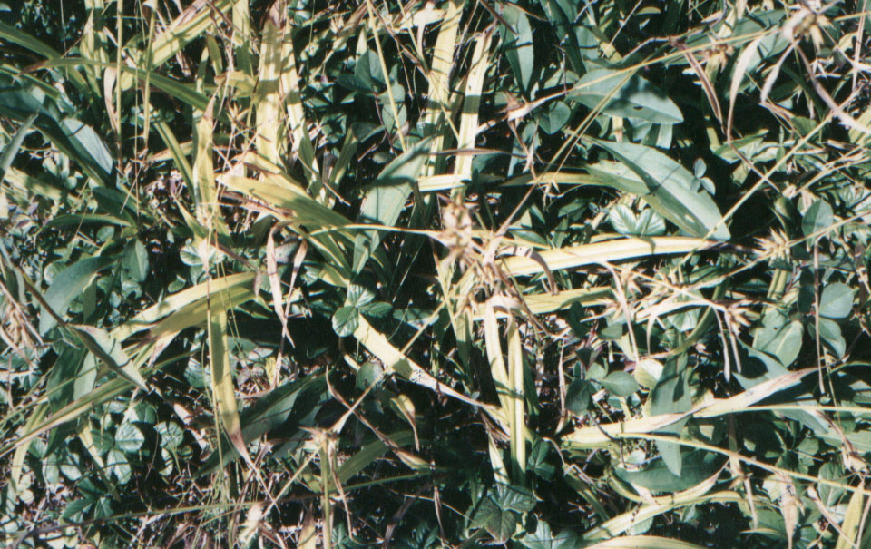 Herbs found in the mostly shaded seep area included Arrowleaf Tearthumb, Hay-scented Fern, Wrinkle-leaf Goldenrod, Mountain Oat Grass ( Danthonia compressa), Fowl Mannagrass (Glyceria striata), abundant, strikingly tall Drooping Wood Reedgrass, Mountain Aster (Aster acuminatus), Cinnamon Fern (Osmunda cinnamomea), Dotted St. Johns-wort (Hypericum punctatum), Crinkled Hairgrass (Deschampsia flexuosa), Autumn bent Grass (Agrostis perennans), Purple-stem Aster (Aster puniceus), Mountain Woodfern (Dryopteris campyloptera), a little of the alien Orchard Grass (Dactylis glomerata), the rush Juncuc canadensis var canadensis, the mannagrass Glyceria melicaria, the sedges Carex debilis, C, C. baileyi, C. gynandra, C. normalis, C. atlantica and C. scoparium, Clayton's Bedstraw (Galium tinctorium), American Brooklime (Veronica americana), the aliens Velvet Grass (Holcus lanatus), Rough Bluegrass (Poa trivialis), Bitter Dock (Rumex obtusifolius) and Thyme-leaved Speedwell (Veronica serpyllifolia), Rice Cutgrass, Turtlehead (Chelone glabra), Northern Bugleweed (Lycopus uniflorus) and Fowl Bluegrass (Poa palustris) .
