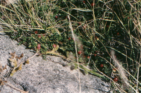 Ground cover in heath areas is dominated by acid soil species such as Teaberry (Gaultheria procumbens), Trailing Arbutus (Epigaea repens), Ground Berry (Rubus hispidus), Large and Small Cranberries (Vaccinium macrocarpon and V. oxycoccos), Sphagnum and Polytrichum mosses, Cladina and Cladonia lichens. Associates are Bog Goldenrod ( Solidago uliginosa), Narrow-leaved Gentian (Gentiana linearis), Cotton Sedge (Eriophorum virginicum), as well as other sedges and a few grasses. Other, perhaps less acid, seeps may contain Arrow - leaf Tear Thumb (Polygonum sagittatum ), Small-flowering St. Johns-wort, sedges and wetland grasses such as Rice Cutgrass (Leersia oryzoides) and Drooping Wood Reedgrass (Cinna latifolia) . In adjacent dry open areas flourish Flat-top White Aster (Aster umbellatus), Grass-leaved Goldenrod (Euthamia graminifolia), Wrinkle-leaf Goldenrod (Solidago rugosa) and Bracken Fern (Pteridium acquilinum) . On rocky hilltops at this season was Wild Bleeding-heart (Dicentra exima) still bloomed among blocks of conglomerate, while Hay-scented Fern (Dennstaedtia punctilobula was frost-browned at the forest edge. Although expected in mossy forest enclaves, Canada Mayflower (Maianthemum canadense) was nowhere abundant and, perhaps fortuitously, no Partridge Berry (Mitchella repens), a usual inhabitant of cool acidic environments, was seen on these traverses.