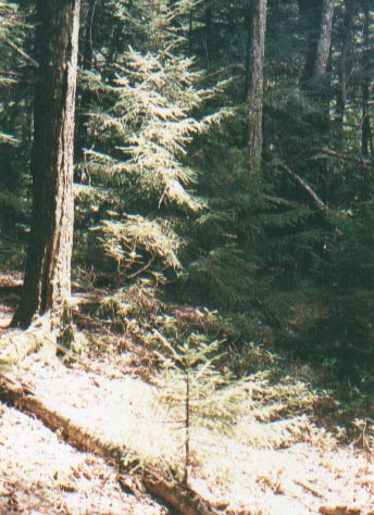 Although no Red Spruce were seen on the first traverse, saplings of this tree are a conspicuous part of the understory along the upper slope toward the northwest. Sizes range from tiny saplings and seedlings to some as large as nine inches (23 cm) dbh. Also, while the bottomland contains few seedlings or saplings of Hemlock, they are far more abundant on the upper slope of this ridge and in some places form dense stands in the understory.