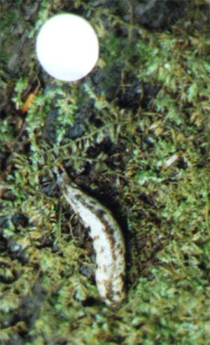 Continuing along the trail toward the north, we noted very conspicuous fruiting of an unidentified species of Hypnum moss on a down bole and a number of inch-long golden slugs of a type (species ?) that appears to be common throughout the Central Appalachians. As we neared the trail terminus we discovered a quite different slug, one inch (2.5 cm) in length, with a striking color pattern of dark brown stripes and blotches on a cream background. Here also, on the previous day, we had taken a soil sample (no 1) from a 2-3 inch depth on a trailside bank among Spruce saplings and an acidiphile ground flora. A pH value of 4.5 was found for this sample.
