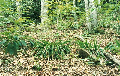 Our detailed inventory along the road was largely confined to the upper road bank, which was under the influence of seeps from the forest upslope and very little -except for dust - from the road gravel. Presumably plants here correspond to those formed in small forest openings under the existing microclimate and aspect. Species successively noted on moving along the road toward the Little Wolf confluence from a little downstream from our camp were as follows: Partridge Berry (Mitchella repens) Hairy Disporum (Disporum lanuginosum), American Spikenard (Aralia racemosa), Christmas Fern (Polystichum acrostichoides), Bluntlobe Hepatica (Hepatica americana), Bracken Fern ( Pteridium aquilinum), Black Cohosh (Cimicifuga racemosa) in bloom, the forest sedge Carex platyphylla, Bowman's Root (Gillenia trifoliata ), White Wood aster (Aster divaricatus) the sedges Carex gracilescens and C. baileyi, Interrupted Fern (Osmunda claytoniana), Gaywings (Polygala paucifolia), a Red-spotted Purple (Lemenitis arthemis astyanax) Butterfly, abundant Great Rhododendron, Teaberry (Gaultheria procumbens ), Pale Green Orchis (Habenaria flava) in bloom, Hog Peanut (Amphicarpa bracteata), Mountain Laurel, Broad-leaved Panic Grass (Panicum latifolium), Whorled Loosestrife (Lysimachia quadrifolia) in bloom, Sassafras and abundant Hemlock.