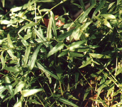 A further survey was also done at the pond (Willow 3) that lies just west of the fork in the woods road and which was briefly visited on 5-23-94 and 8-25-96. As previously noted, Dwarf Upland Willow is conspicuous in this pond's vegetation. Associates were yellow Indian Grass, Little Bluestem, Saw Brier, Creeping Five-leaf, Wild Indigo, Bushy Aster, Arrow-leaf Violet, Bracken Fern and the two milkworts Polygala brevifolia and P. incarnata . In places there was a deep carpet of mosses, including haircap, and Cladina lichen. Haircap, other mosses and Cladina were also abundant under huckleberry at the pond's edge, which is rimmed by Black Gum, Red Maple, Pitch Pine, Post and Pin Oaks and Highbush Blueberry. Also seen here was a Cricket Frog, although no standing water was present.