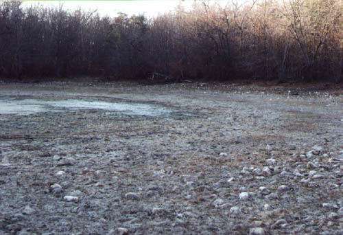 Next visited was the larger pond (Pond Deep 17 of B 13), also along the 1600 foot contour, and which had been the object of our 11-6-94 visit. Like the pond of the previous week, this pond was blessed with rimming frogs that leapt squeaking into deeper water as they were approached. Birds, likely Wood Ducks, also rose from the water. The only conspicuous herbaceous vegetation noted consisted of spikerush, some panicum and a few clumps of White Buttons. A soil sample (MF4) was taken from the water's edge. The loud drumming of an unidentified woodpecker sounded from the surrounding woods.