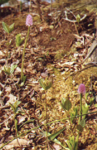 At Spring Pond the entire surface was dotted with the flower spikes of Golden Club, and along the shore, Highbush Blueberry and Minnie-bush (Menziesia pilosa ) were leafing out. In one place a single, partially-submerged plant of Swamp Pink was in bloom. Golden Club and Skunk Cabbage (Symplocarpus foetidus) showed evidense of having been fed upon, perhaps by Muskrat ( Ondara zibethica) , Beaver or Deer. Other herbs noted here were Fly Poison (Amianthium muscaetoxicum), Kidney-leaf Grass of Parnassus (Parnassia asarifolia), Shining Clubmoss (Lycopodium lucidulum ), Tree Clubmoss and Bracken Fern.