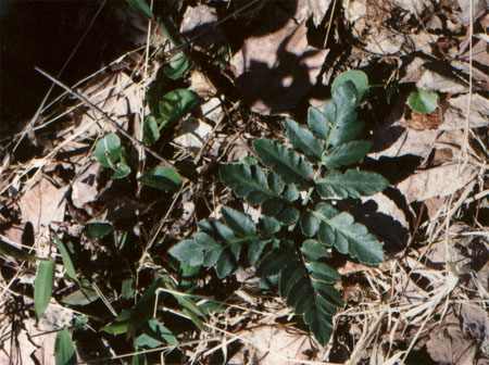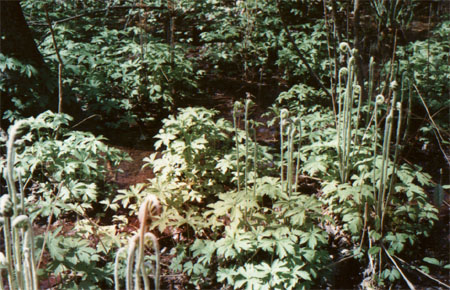 Also found in an area of dumped spoil that appeared enriched in nutrients were Sensitive Fern, a single plant of Wild Geranium (Geranium maculatum ) and a small patch of May Apple.