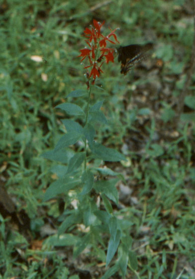 Before entering the swamp we noted Golden Aster (Chrysopsis mariana ), Primrose-leaf Violet, Wild Senstive Plant (Cassia nictitans ) and Autumn Bent Grass (Agrostis perennans ). On entering the swamp we saw Virginia Yellow Flax (Linum virginianum) and Cardinal Flower in full bloom with many swallowtail butterflies (Papilio sp) in attendance. Within, and in close proximity to the stream, we saw an unidentified quillwort (Isoetes sp), Crayfish, minnows and a Green Frog. Fungi in the vicinity included Red Chantrelle (Cantharellus cinnabarinus ) and species of Russula and Entoloma. Next seen were Carex lurida, Wrinkle-leaf Goldenrod (Solidago rugosa), White Grass ( Leersia virginica), Cutleaf Grapefern, Large-flowered Skullcap, Carex swanii, Common Beggar-ticks (Bidens vulgata ), New York Fern and a single Black Haw Viburnum. The calls of a Piliated Woodpecker ( Dryocopus pileatus ) were heard at intervals.