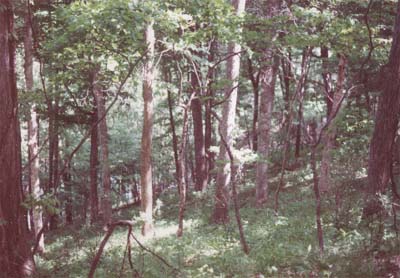 Farther along we noted an apparent increase in the number of Black Maple seedlings, then abundant young Hemlock. We now became aware of a much denser ground flora immediately down-slope to the east, perhaps marking an exposed stratum of more nutrient-rich rock there. Here also we began to see, on the forest floor, tunnels of a wood vole, possibly those of the Pine Vole (Pitymys pinetorum) .