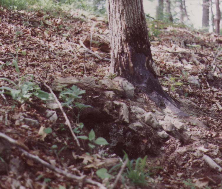 Soils here appear to be generally moist. A sample (3) was taken from a 2-3 inch depth at the highest point on a nearly flat aspect. This soil had a low density as a result of a high percentage of organic matter, was moist and almost black in color. However, it contained many small rock fragments. An initial pH value of 5.2 was obtained for this soil, but after 24 hours this had increased to 6.2, perhaps as a result of included carbonate fragments. The soil temperature ( T-62) taken at a 5 inch depth was T=12.5 deg C. Immediately down- slope to the southeast of the highest point we saw a large (20 inch / 0.5 m) dbh multistemmed White Basswood (Tilia heterophylla), Black Oak and Black Maple, with the latter the likely source of the seedlings first identified by R. Hunsucker along the spur to the north. Also present down –slope were young Tuliptree and a dense ground cover dominated by sedges that includedCarex canoidea, C. digitalis, C laxiflora, C.. communis, C. platyphylla, C. pensylvanica and C. cephalophora. Other species noted on this slope were Redbud (Cercis canadensis), Cleavers (Galium aperine), Carrion Flower (Smilax herbacea), a little Intermediate Shield Fern (Dryopteris intermedia), Smooth Sweet Cicely (Osmorhiza longistylis), Wild Liquorice (Galium circaezans), the grass Brchyelytrum erectum, abundant Black Cohosh and the edible fungus Tricholomopsis platyphylla ("Platterfull") . Both seedlings and saplings, as well as large trees of Black Maple were common. In one case a large Black Maple extended its roots into an ash gray "rotten" sandstone which effervesced to acid, and thus proved to be calcareous. The base of this tree, as well as others, showed evidence of fire in the form of blackening and scarring, and were accompanied by partially burned down wood. It should also be mentioned that the leaves of some Maples here bore resemblances to those of both Sugar and Black Maples.