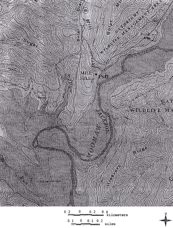 Mill Hill is a half mile (0.8 km) long, tadpole-shaped hill with a N-S orientation. Elevations range from 1550 to 1850 feet (473 to 564 m) asl. It is cut off from the southwest end of Bolar Mountain by Mill Creek (see our section on Bolar Mountain), and the waters of the Lake Moomaw impoundment abut it on the east. The Hill is along the strike from Blowing Springs (see our section on the latter) and is underlain by the same Upper Silurian/ Lower Devonian lithology (Rader and Evans, 1993) . This lithology is complex and includes shales, which are exposed at the Hill base, limestones and sandstones. It is likely that the latter, as the most erosion resistant type, form the Hill's crest. Of particular interest are calcareous sandstones, in which silica grains are cemented by calcium carbonate, and which may give rise to substrates for plants much like those derived from limestone. Since these rocks are highly deformed the same rock type may appear in different relations to other rock types.