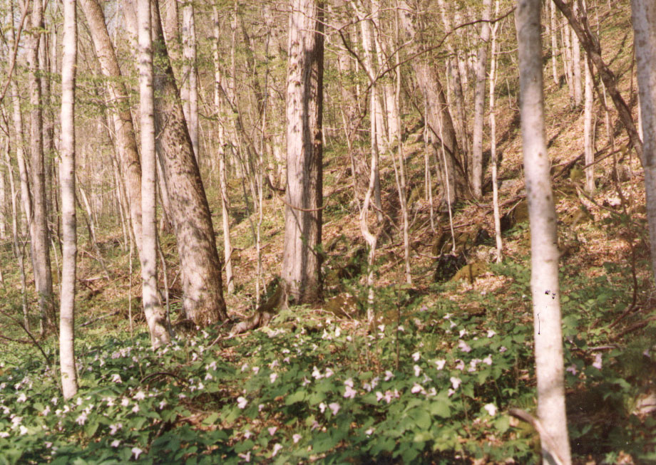 Moving west on the terrace and parallel to the stream bank, we encountered a dramatic change in the flora and a great increase in undergrowth. This undergrowth included Paw Paw, Black Locust, Muscletree, Coral Berry, Poison Ivy, White Wood Aster, Cutleaf Toothwort in seed, Black Cohosh, Meadow Garlic (Allium canadense) , the trout lily Erythronium americanum (as distinguished from E. umbilicatum found on the terrace above ), Common Many Knees and Wild Stonecrop. The undergrowth was accompanied by very little moss but an unidentified species of Atrichum. Just above, on the lower slope, stood a large Sugar Maple, its base heavily covered by a species of Anomodon moss and Wild Stonecrop. In summary, this community appeared to bespeak a rich soil. In appearance a sample of this soil (no 7) taken here at a depth of 2-3 inches, was similar to the previous sample. However, given the observed flora, it came as a surprise that it also had a pH of 4.5 both initially and 24 hours later. It may be that this sample was not representative of soil dominating the root zone , although this flora is not necessarily excluded at this pH.