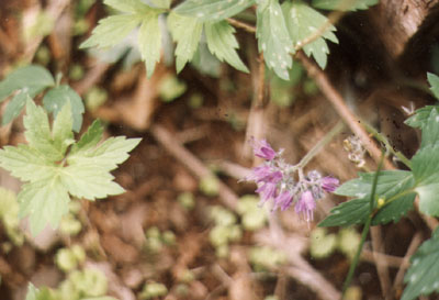 The Virginia Natural Heritage Program established two 400 square meter test plots in Crizer's Gap (Fleming, 1999) . One of these plots, with a southwest aspect, is located on the northeast side of the Gap at an elevation of 1500 feet (458 m) asl, and was classified as "dry mesic calcareous forest". The other plot, on the southwest side of the Gap, has a northeast aspect, lies at about 1400 feet (427 m) asl and is in "rich cove/ mesic slope forest". Because these plots do not include as many microhabitats as occur along the stream, a number of species observed by us were not reported for them. Notably absent were Great Rhododendron, Common Many Knees, Mealy Bellwort and Red Maple. However, either specific to the slope habitats or missed by us, were the ferns Purple Cliffbrake (Pellaea atropurpurea) and Hairy Lipfern (Cheilanthes lanosa) , as well as Cliff Stonecrop (Sedum glaucophyllum) – all on the dry mesic calcareous slope. We also failed to find a number of species such as Bladdernut (Staphylea trifolia) , Hairy Heuchera (Heuchera villosa) and Blue Cohosh (Caulophyllum thalictroides) found by Fleming in the rich cove/ mesic slope forest.