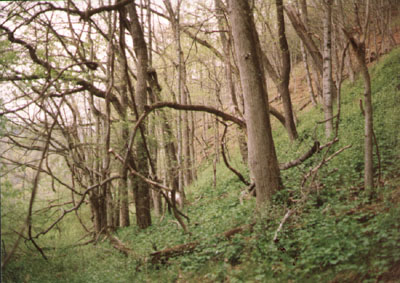 The slope is occupied by an impressive mature and rich mesic forest consisting of Northern Red Oak, Sugar and Black Maples, White Ash, Black Walnut, Basswood and, at the slope's foot, Ash-leaf Maple. Few shrubs were noted, but Bladdernut and Coral Berry were common at the slope's foot.