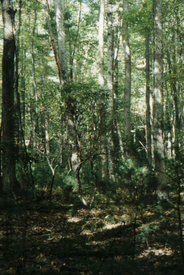 The forest here was mature but clearly young and the canopy was dominated by White Pine, Adelgid infested Hemlock, Northern Red, White and Chestnut Oaks, Shagbark Hickory and Red Maple, with a little Sugar Maple, Black Birch, and Cucumbertree. A single mature White Ash was seen. Seedlings of Red Maple and White Pine were very common and those of Northern Red Oak almost as common. Seedlings of Sugar Maple and White Ash had a scattered presence and those of Cucumbertree occurred in a few spots in the vicinity of mature trees. A few seedlings and saplings of Hemlock were also seen. The most abundant shrub appeared to be Mountain Laurel. but Witch Hazel was also present.