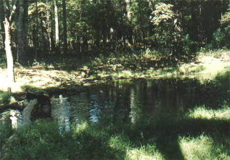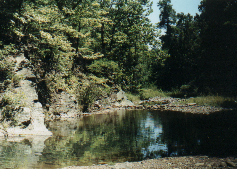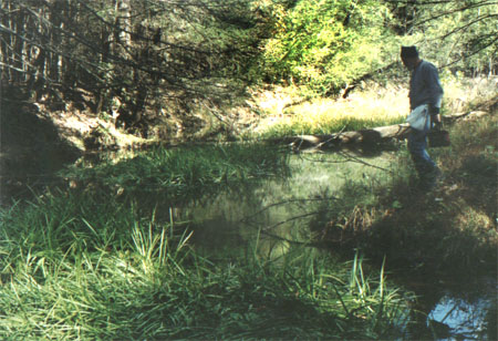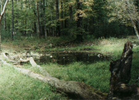We presently arrived at a small linear wetland that extended down-valley and, at least in part, had its source in a small pond about 10 meters in diameter. From the large trees on its bank and lack of any sign of excavated material, the pond appeared to be natural and likely marked a sinkhole. Water from this pond had a temperature (T-244) of 16.0 deg C and a pH of 6.8, a value consistent with limestone influence in this generally acidic terrain.