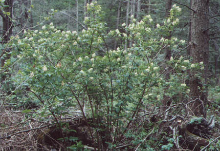 The most common large shrubs were Spice Bush ( Lindera benzoin) and Witch Hazel ( Hamamelis virginiana ), but Mountain Laurel was also frequent in places. Black Raspberry ( Rubus occidentalis ), the alien but unobtrusive Wine Berry (R. phoenicolasius ), as well as Coralberry (Symphoricarpos orbiculatus ) were scattered throughout, but apparently confined to patches of fertile soil. Virginia Creeper (Parthenocissus quinquefolia ) and Poison Ivy (Rhus radicans) were the most common vines, followed by Common Greenbrier (Smilax rotundifolia ), occasional Summer Grape (Vitis aestivalis ), Dutchman's Pipe vine (Aristolochia macrophylla ) and a Dewberry (Rubus sp).