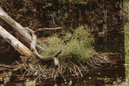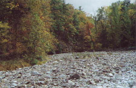 Our traverse downstream began at 10:00 AM on 10-19-98 under overcast and a sprinkle of rain that gave way in the afternoon to almost clear skies. As is usual for this time of year, low water prevailed, and visible water occurred only at intervals where holes in the bed were deepest. However, springbrooks, some perhaps from diverted subsurface stream water in the thick boulder and cobble deposits of the bed, were common. Soils were generally sandy, reddish in color, and confined to favorably-located bars and banks. These soils were clearly of recent alluvial origin and quite rich in organic matter near the surface. Unlike that of mor soils, this organic matter had the appearance of incorporation into the mineral component by soil organisms.