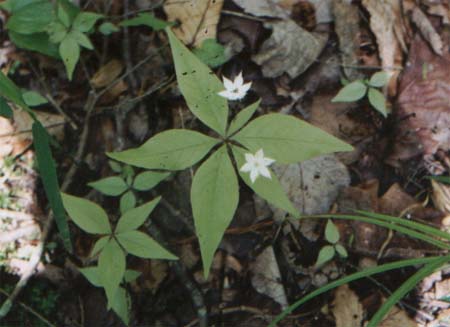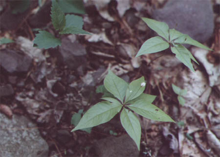 Our inventory of 5-3-94 was again confined to the area extending upstream from the bend to the vicinity of the red sandstone outcrop on the west side of the flood plain. The weather was cool, somewhat windy and gradually clouded over. A high point of this inventory was discovering a few plants of blooming Star Flower (Trientalis borealis ) under Hemlock. On this day also the Red Elderberry mentioned previously was in bloom. Other species identified for the first time were Long-spurred Violet (Viola rostrata), also in bloom, Wild Ginger (Asarum canadense ), Interrupted Fern (Osmunda claytoniana ), Hairy Disporum ( Disporum lanuginosum), Golden Ragwort (Senecio aureus), Wild Liquorice ( Galium circaezans ), Dotted St. Johns-wort (Hypericum punctatum), the wood rush Luzula acuminata, Adam's Needle (Yucca filamentosa) the alien Corn Speedwell (Veronica arvensis) and White Wood Sorrel (Oxalis montana). The Woodland Strawberry (Fragaria vesca ) encountered here was not categorized as either native or alien. Similarly, the profusely-blooming bluets could have been either Spring (Houstonia caerulea ) or Thyme-leaved (H. serpyllifolia ).