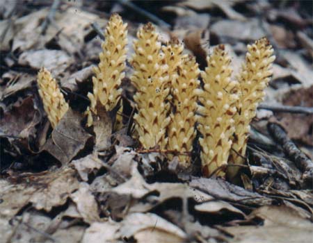 Source Walk: 6-4-01General conditions this day included mild temperatures and overcast skies that cleared about !:00 PM. Trees on slopes were leafing out and a number of plants such as Bloodroot and Miterwort were budding, Early Saxifrage was in bloom and Canada Mayflower and May Apple (Podophyllum peltatum) were leafing out. A good number of small birds, some with yellow feathers, and probably warblers, were active in the canopy and shrubbery. It should also be mentioned that contrary to an earlier (1998) impression, the apparent effect of the Hemlock Wooly Adelgid is very great in this forest, particularly in the form of a thinned canopy and dead large trees.