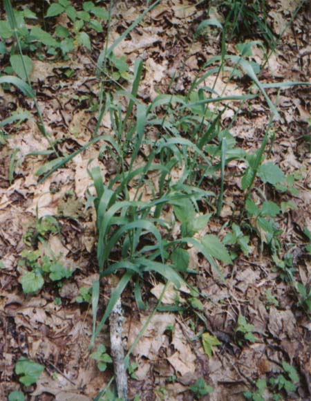 Advancing along the trail, we came to a derelict Game Commission building under large White Pine, and under these grew Spotted Wintergreen and Roundlobe Hepatica. However, only a little beyond the Pines, we saw the uncommon Millet Grass (Milium effusum), that is usually found on fertile soils and/or at high elevations and is listed as rare by the Virginia Division of Natural Heritage. Here this grass grew under Hemlock, White Oak, White Pine, Black Birch and Red Maple at the edge of the trail-from which it may have derived nutrients. (We were to learn later that it is a common grass in this valley.)