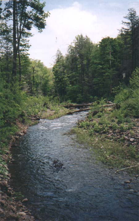 Of particular interest on this day were the fauna observed. These included the first Scarlet Tanager (Piranga olivacea ) and Red-eyed Vireo (Vireo olivaceus ) of the year, but most particularly a close look at Blackburnian Warblers (Dendroica fusca ), which were active in low shrubbery. According to Robbins (1996), this warbler is frequently associated with old growth Hemlock, a forest type that occurs just upstream in the Draft. Also seen on this day were efts of the Eastern Newt ( Notophthalmus viridescens) emerging from small ponds in the woods.