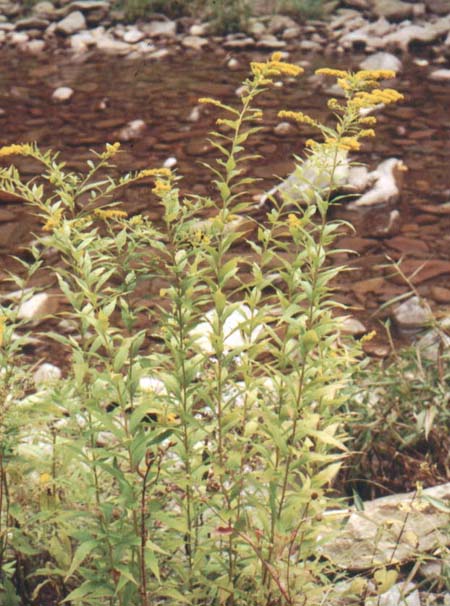 Passing through the open area at the cliff base and over large cobbles, we encountered the tick- trefoil Desmodium paniculatum in the dry stream bed, while nearby grew Silverrod (Solidago bicolor), Grass-leaved Goldenrod (Euthamia graminifolia ), beautifully blooming Wrinkle-leaf Goldenrod (photo), Woodland Sunflower, Heath Aster (Aster pilosus) and, at the water's edge, Carex scabrata.