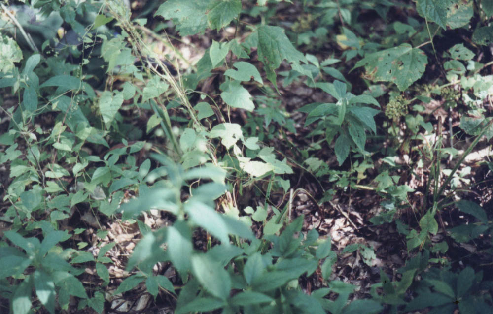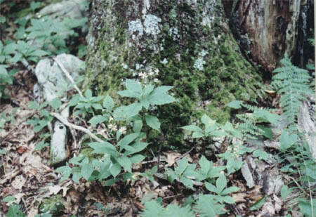 In midmorning of 6-14-00 an inventory was done of a gently sloping bench that overlooks the South Branch of the Potomac Valley. Elevation here is also near 4200 feet and the aspect west, although almost flat. The area inventoried was of the order of an acre (0.4 ha), and weather conditions were sunny, cool and pleasant.
