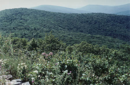 In addition to geologic substrate other important factors in the distribution of forest types in the Central Appalachians are temperature, precipitation and cloud cover. While these factors are interrelated, independent data exist for each. A feature of the Appalachians is the northeast – southwest orientation of isotherms over much of the region (U. S. Dept. of Commerce, 1966). Consequently the greatest drop in temperature may occur in going from east to west or vice versa rather than from south to north. Because the lowest temperatures in the Central Appalachians occur in West Virginia's Alleghenies, temperatures at any given elevation there are likely to be lower than those at the same elevation on Shenandoah Mountain. In general this is reflected in the relative numbers of northern and high montane species found in the two regions.. To a degree also, Shenandoah Mountain lies in the rain shadow of the high Alleghenies, although the elevation of the former probably enables it to intercept more precipitation than the lower ranges in the vicinity. It also lies considerably east of the Central Appalachian cloudy-day maximum (Reifsnyder and Lull, 1965), which also falls in the region of the high Alleghenies. As suggested earlier (Mueller, 1994), this factor may contribute to the more mesic character of the Allegheny forests in comparison to those of the Valley and Ridge, including Shenandoah Mountain.